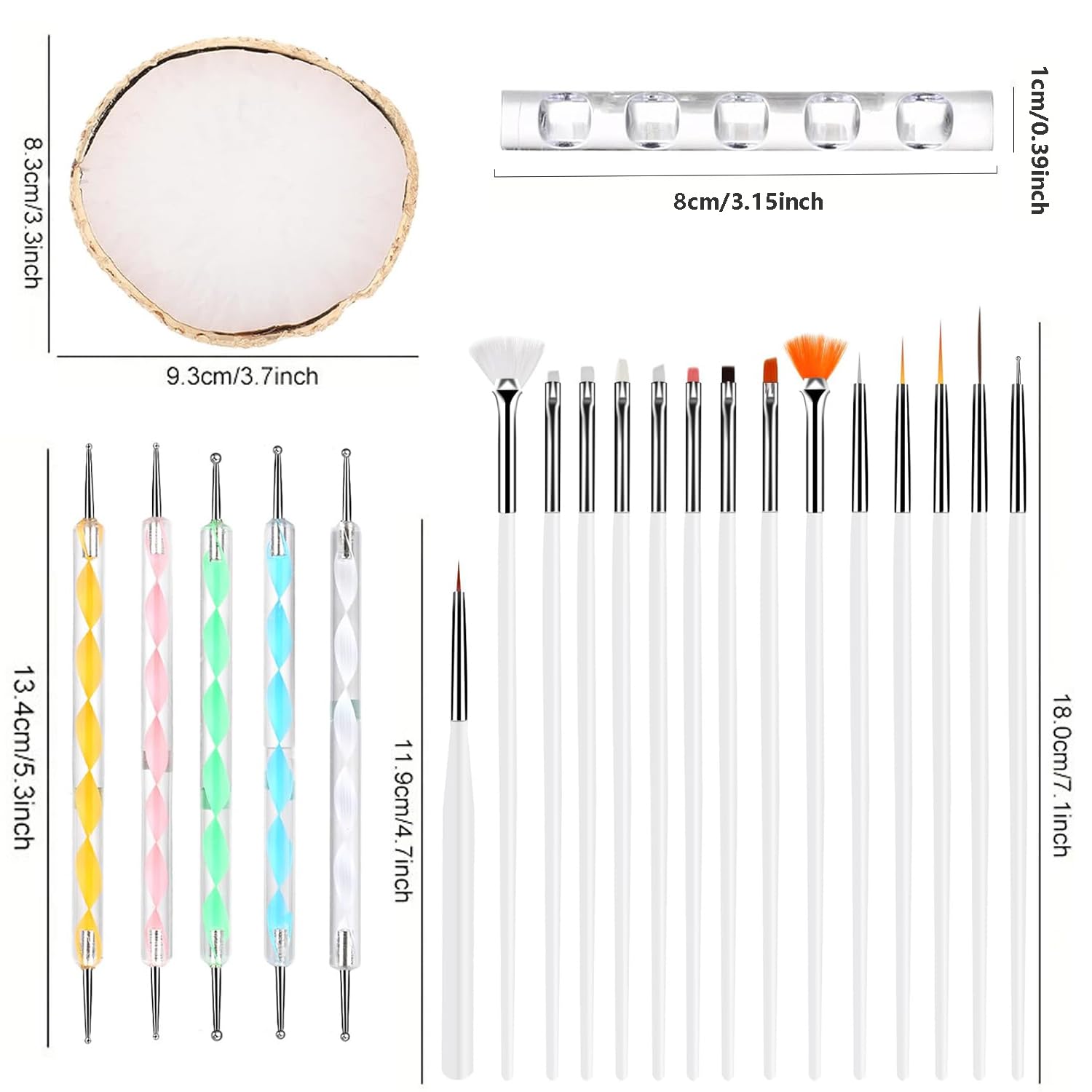 - 【Package Includes】You will receive a nail tool set which includes 15 nail brushes, 5 double-ended mixed size dispensing tools and 1 gold edge resin nail palette.