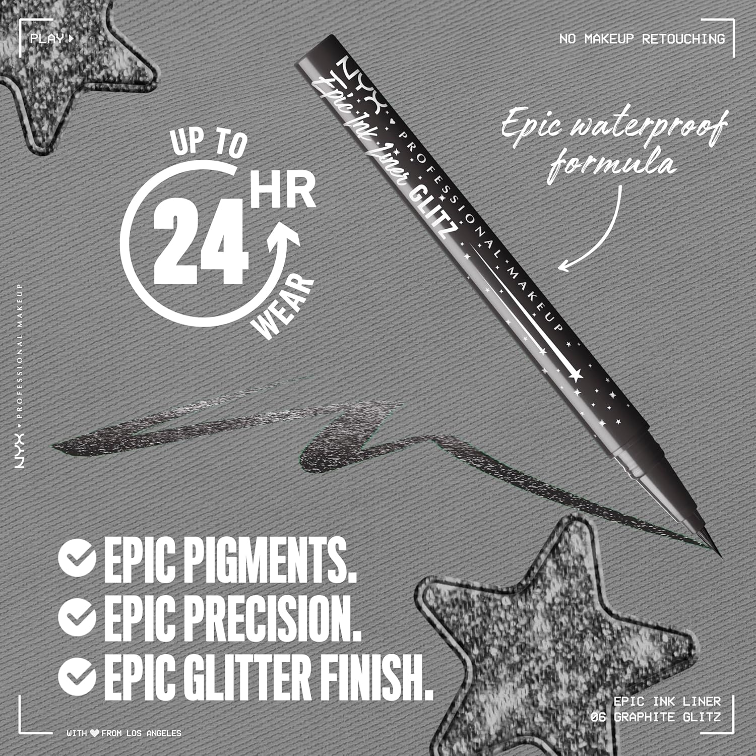 - Waterproof Glitter Eyeliner: Our Epic family just got even more epic with this highly-reflective glitter eye liner for saturated lines that last. Now in 6 new glitzy shades - this epic glitz hits
