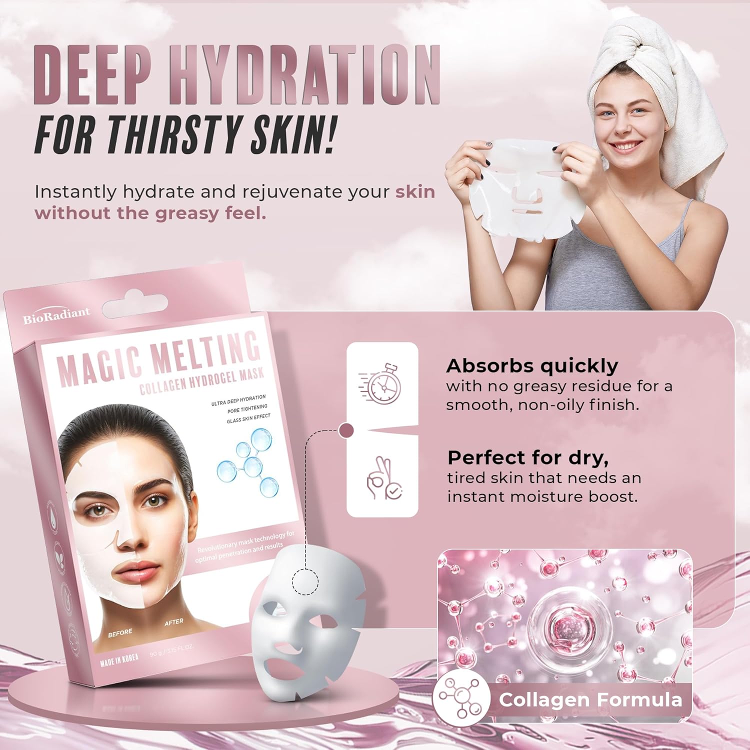Magic Melting Face Mask - Collagen Ultra Hydrating Overnight Hydrogel Mask, Pore Minimizer For Face with Glass Skin Effect - Vegan, Clean Beauty, Made in Korea - Pack of 6