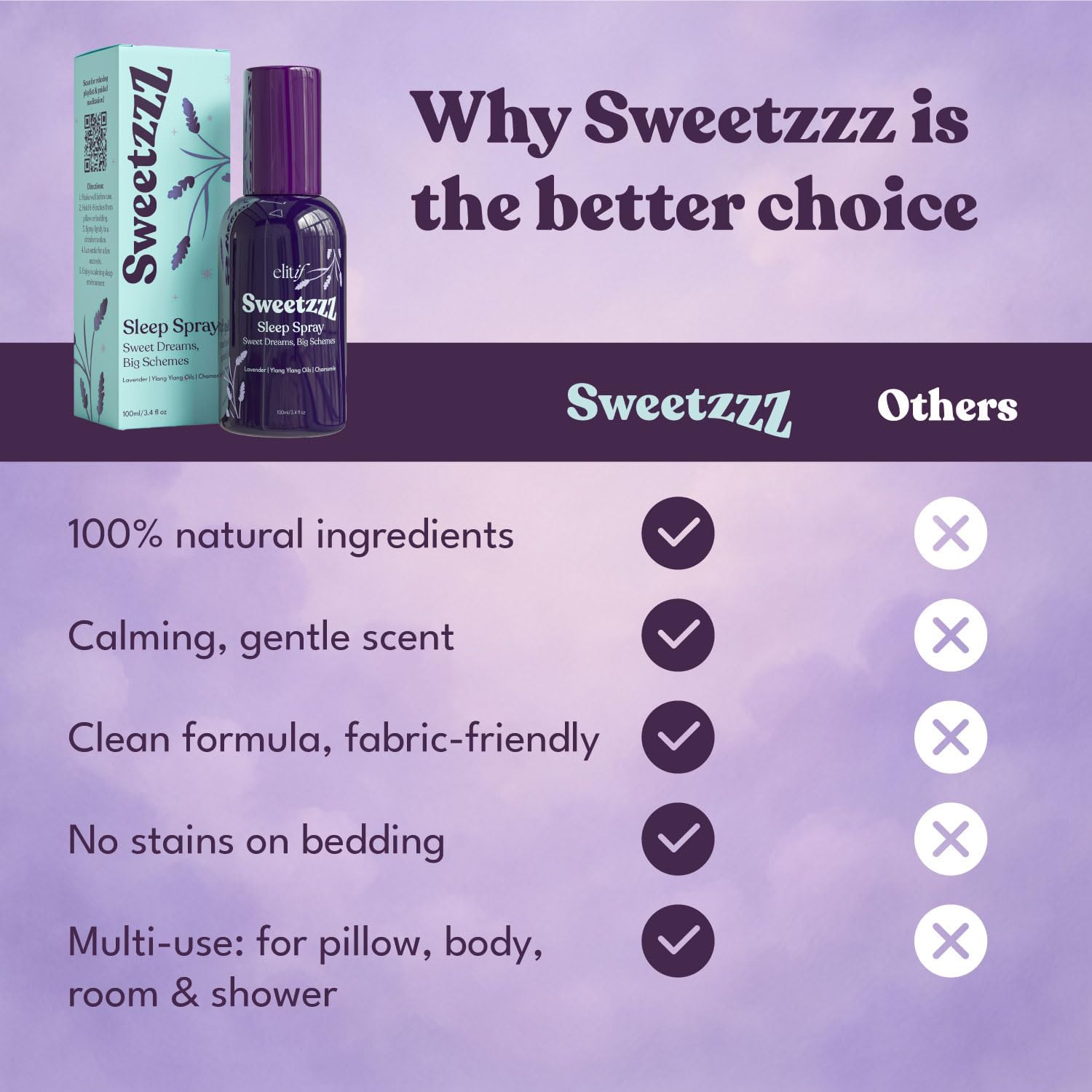 - ✈️ Travel-Ready Relaxation – Take your sleep ritual anywhere with Sweetzzz, a TSA-friendly lavender pillow spray. Calm your senses on flights, hotels, or stressful nights away from home.