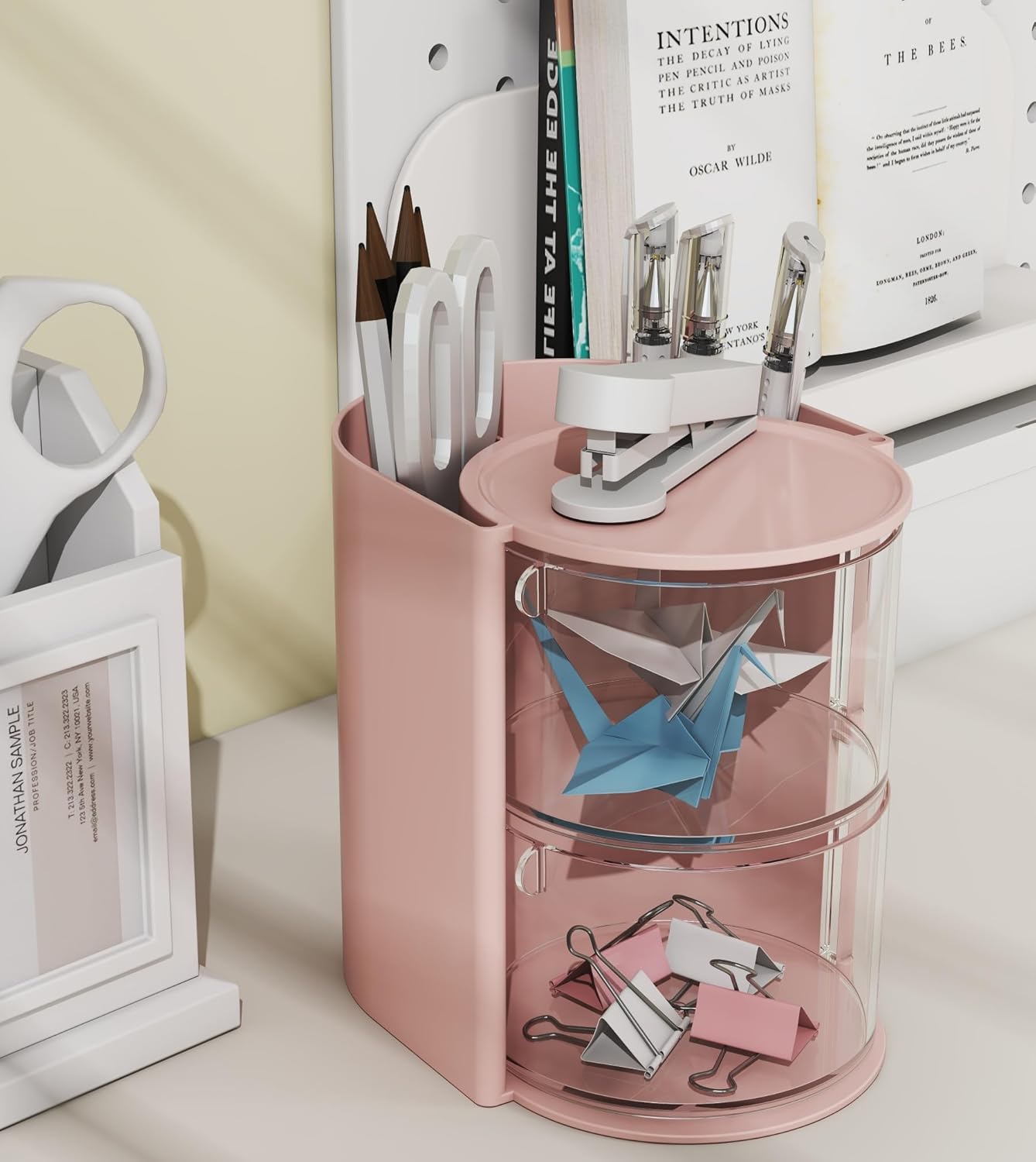 Hair Accessories Organizer with Hair Brush Holder, Rotatable Makeup Brush Holder for Necklaces, Earring, Bracelet, Ring, Makeup Brushes, Hair Clip and Hair Accessories (Pink, 2-Layer)