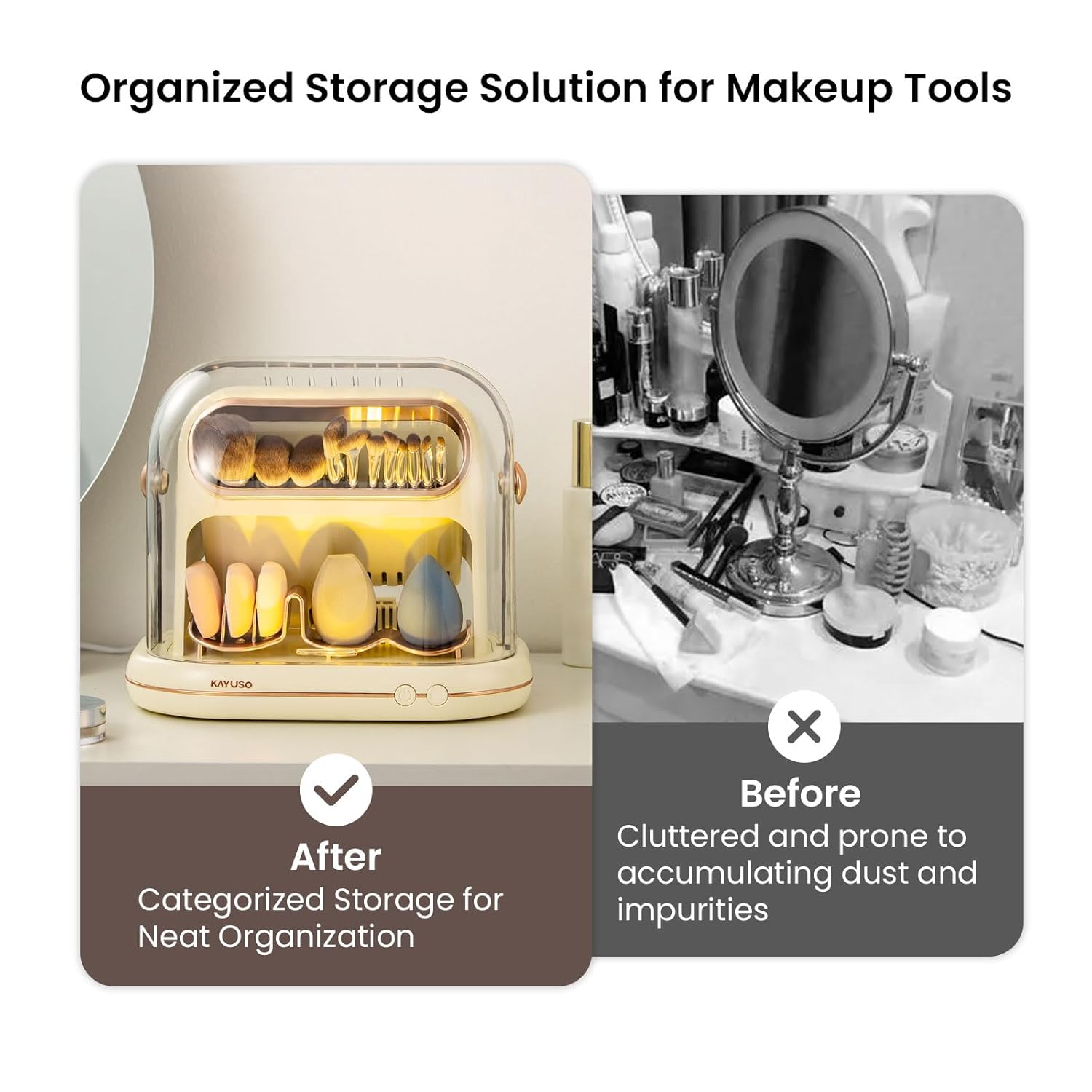 - The 360° Circulating Dry system: The makeup brush dryer features smart zoning for optimal care. The upper low-temp zone preserves brush shape while keeping bristles fluffy and soft, preventing bristle damage for long-lasting premium quality, while the lower medium-temp zone uses direct airflow for efficient drying that maintains elasticity and shape in beauty blenders and sponges—no deformation, just lasting bounce