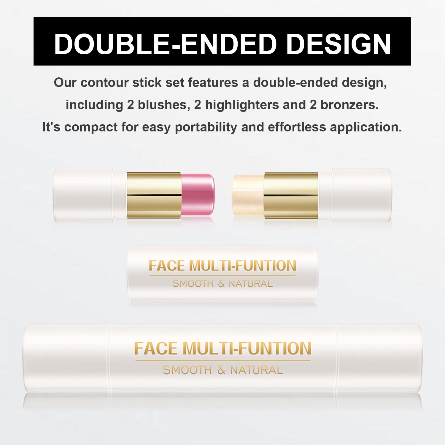 - 【Dual-Ended Design】Replace 6 makeup products with 3 double-ended sticks. Sculpt cheekbones, brighten under-eyes, contour nose, and blush cheeks with one portable tool – perfect for travel touch-ups.