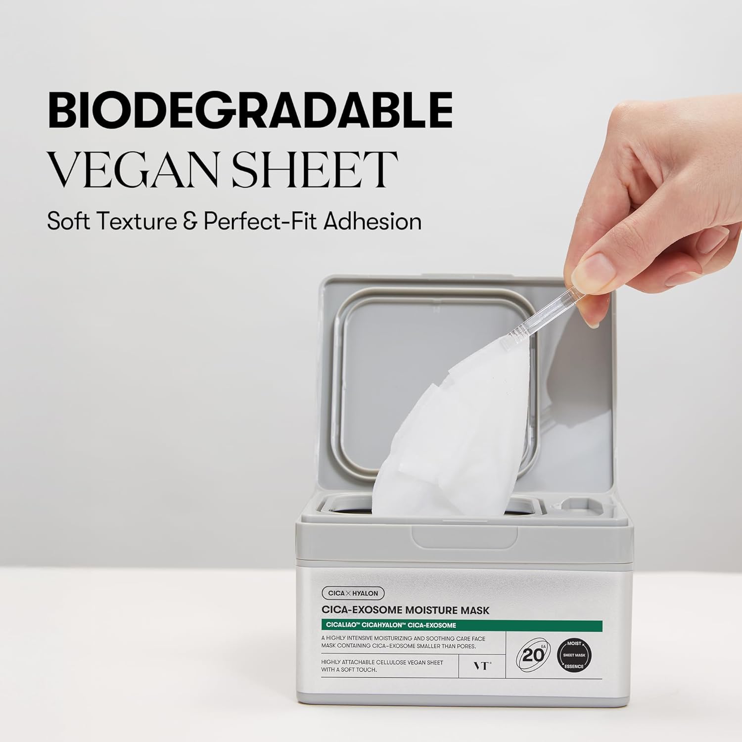 VT COSMETICS Cica-Exosome Moisture Mask 20 Sheets, Centella Asiatica & Hyaluronic Acid with Exosomes for Deep Hydration & Calming, Biodegradable Vegan Sheets, Korean Face Mask