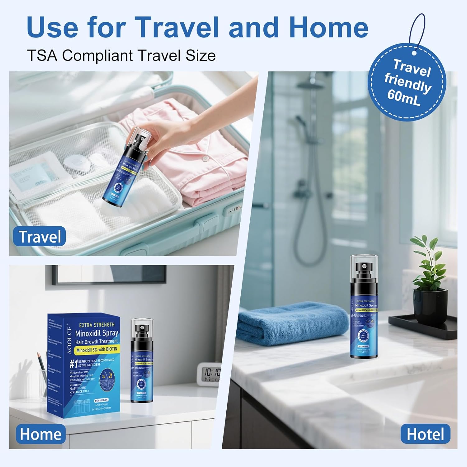 - ADVANCED FORMULA - AOOLCF Minoxidil Spray combines 5% Minoxidil, 0.5% Biotin, Castor Oil, Panthenol, and Glycerin to stimulate hair regrowth, resulting in noticeably thicker, fuller, and younger-looking hair