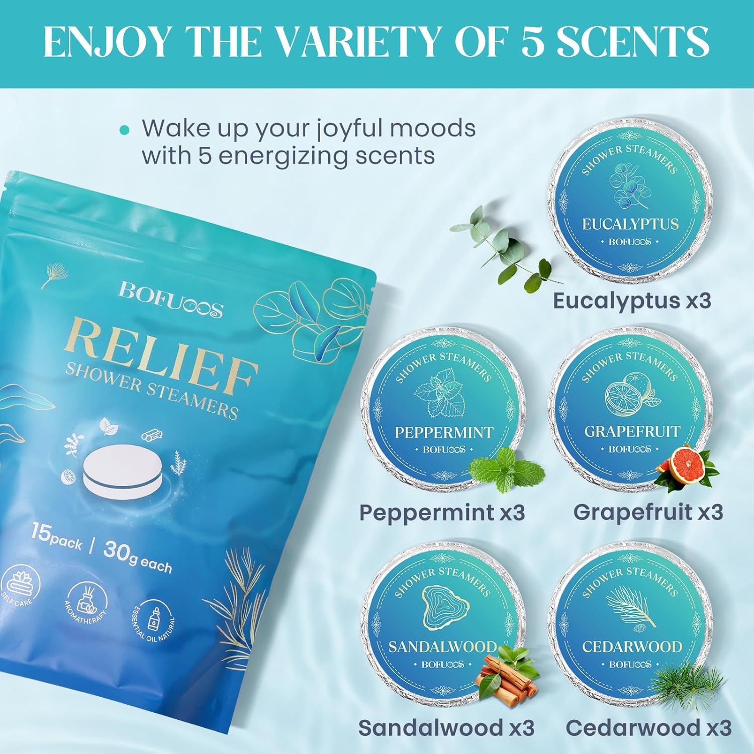 - Aromatherapy Experience: These shower steamers provide a relaxing aromatherapy experience with 5 unique scents— Cedarwood, Sandalwood, Eucalyptus, Peppermint, and Grapefruit. Transform your shower into a spa-like retreat.