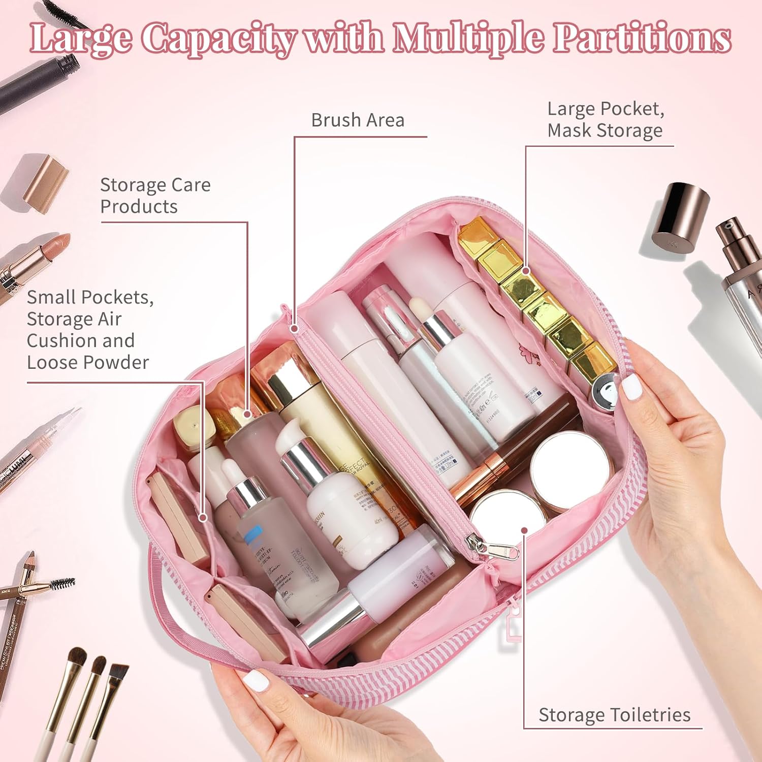 Travel Makeup Bag for Women, 2Pcs Portable Personalized Initial Makeup Organizer Bag, Open Flat Large Cosmetic Bag With Travel Essential Pouch (Pink Letter R)