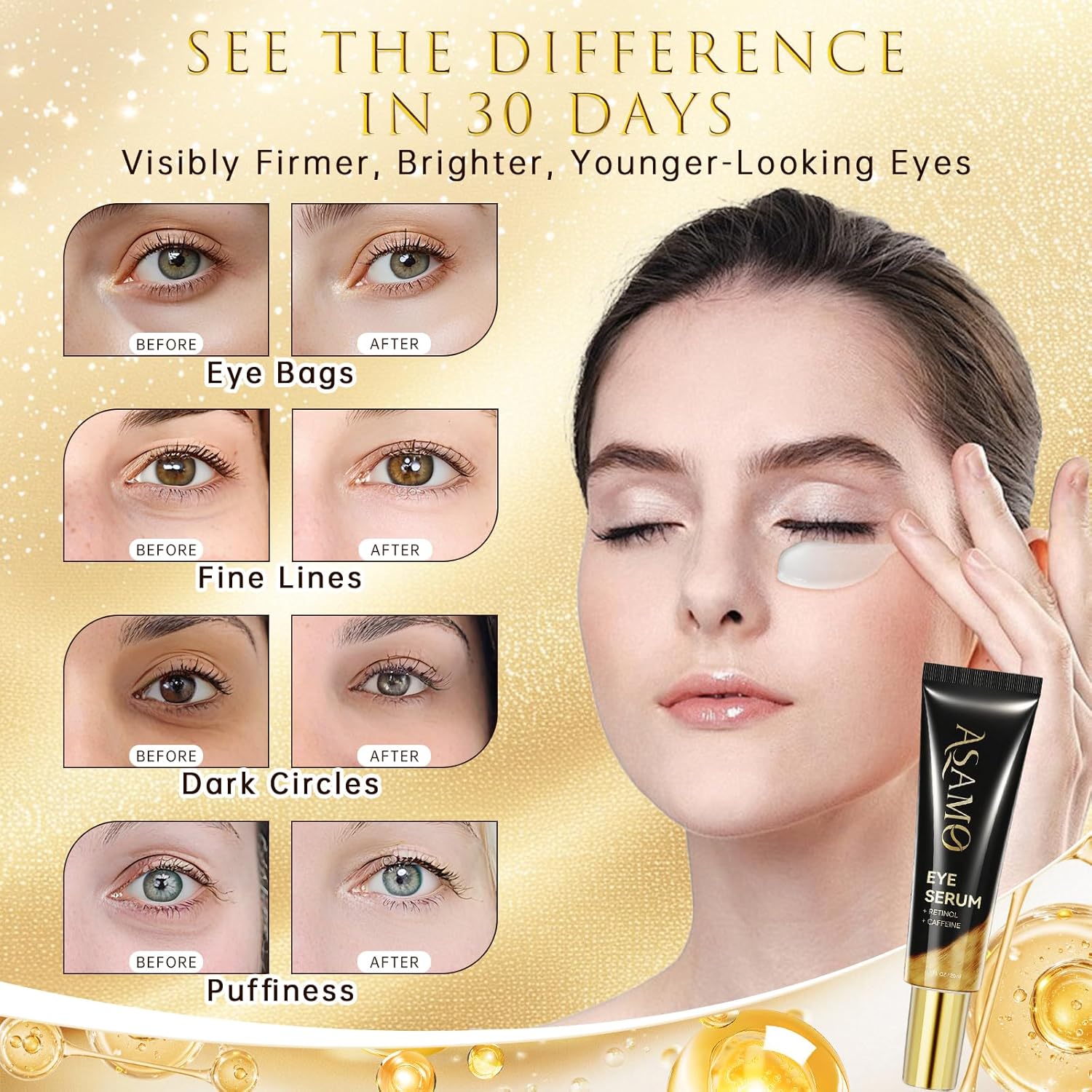 ASAMO Retinol&Caffeine eye serum, Fast Absorbing, Correction for Puffy Eye Bags Fine Lines Dark Circles Wrinkles, 48Hr Hydrating Under Eye Cream, 0.7fl.oz