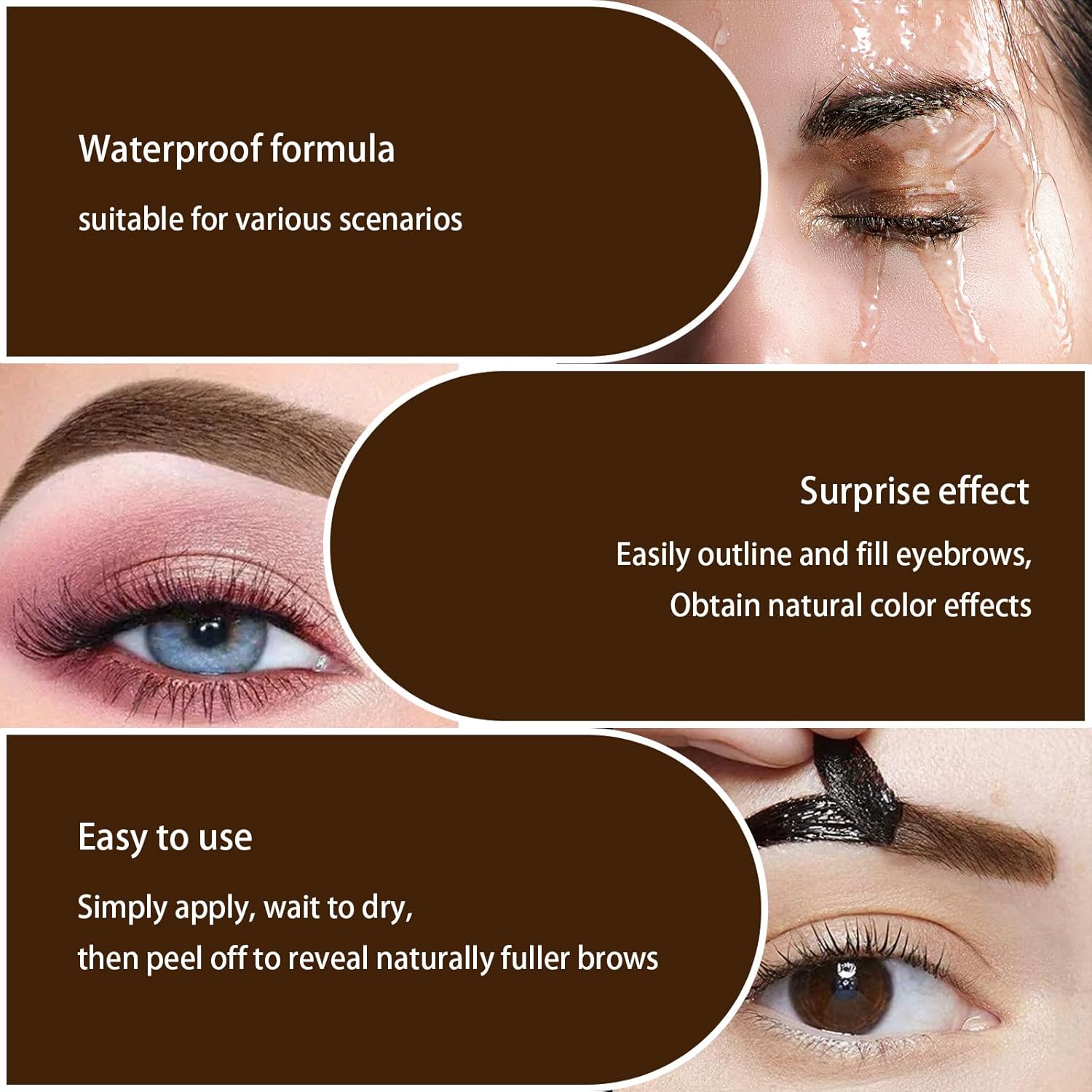 - Easy to Use: Simply apply the gel gently to your brows using the brush, then wait for 30 minutes or more before gently peeling it off to achieve fuller brows. After peeling, avoid water contact immediately to allow the color to set and maintain its waterproof properties.